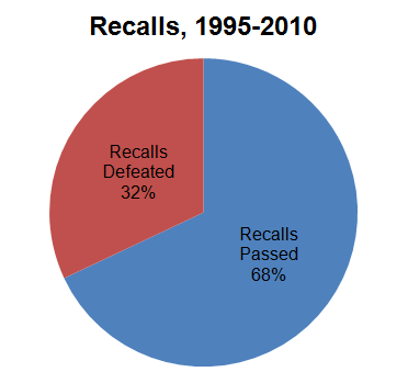 The CSUS data shows that from 1995-2010, there were 256 local recalls, of which 175 recalled the elected official and 81 officeholders hung on to defeat the recall election (a 68% removal rate). Specifically, there were: