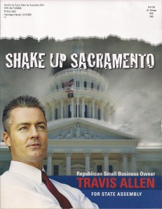 This blog has been a bit rough on Travis Allen over the past few weeks but he will be happy to know that he is going to be getting some positive press here. It appears that he has sent out a mail piece to AD 72 voters and left a copy of the pieces on chairs at the meeting last night.