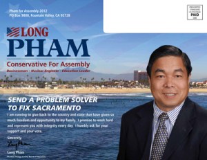 It appears that Travis Allen is not the only one in the mail. Long Pham has also sent out a mailer to AD 72 voters: