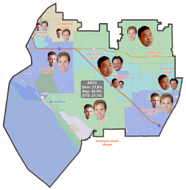 (Thanks to Matt Rexroad and Chandra Sharma at Meridian Pacific for the map, which I’ve cropped here and to which I have added graphics.  Note that the population numbers on the map apply to each whole city, not just the portion of the city in AD-72.  Huntington Beach is divided nearly 50/50 between AD-72 and AD-74.  A sliver of Santa Ana and the bulk of Garden Grove are in AD-72 while the bulk of Santa Ana and a sliver of Garden Grove are in AD-69.)
