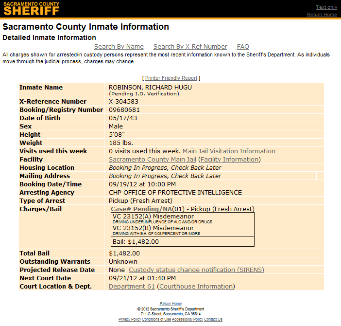 (Updated 8:09 AM): Robinson was released by the Sacramento County Sheriff this morning. Here is his booking photo: