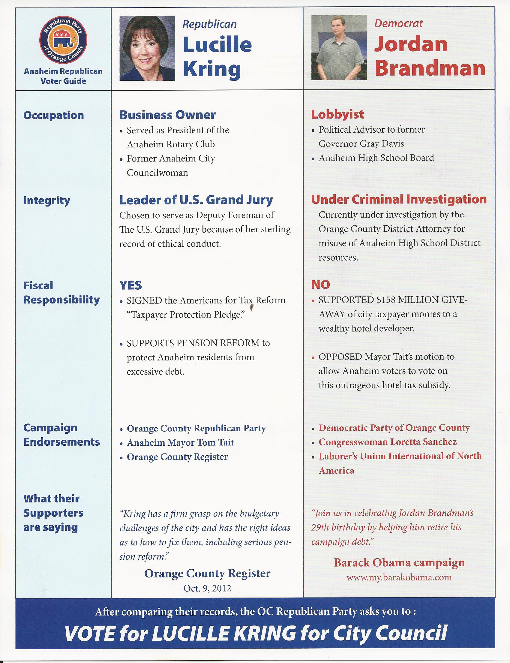 Another mailer that I received over the weekend was this piece paid for by the Republican Party of Orange County. It is another 8.5 x 11 piece with a huge OC GOP logo on the front. On the back it compares Lucille Kring and Jordan Brandman.