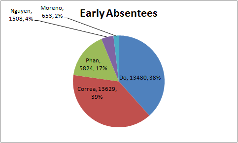 There are 637 outstanding absentee ballots and 1264 outstanding provisional ballots.  If the remaining absentee ballots come in at the same rate as the other late absentee ballots, Do will have 18,491 votes while Correa will have 18,220, a lead for Do of 271 votes.