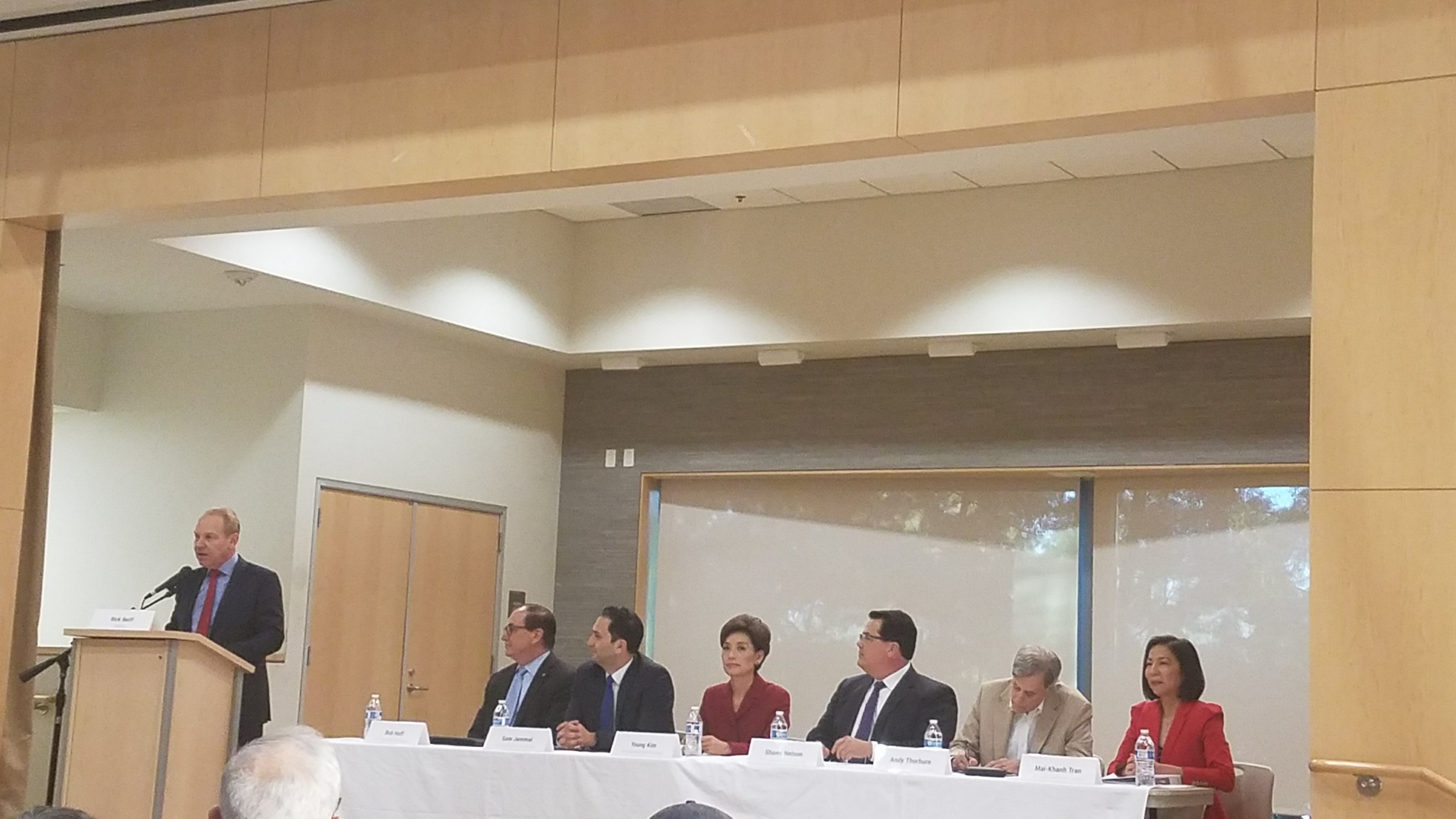 We are live from the 39th Congressional District debate sponsored by the U.S. Chamber of Commerce and the North Orange County Chamber of Commerce at the Fullerton Community Center, which has a parking lot that is ill-equipped to handle this large a crowd though there is plenty of seating inside the venue. The debate is moderated by Rick Reiff, host of Inside OC and editor-at-large of the Orange County Business Journal.