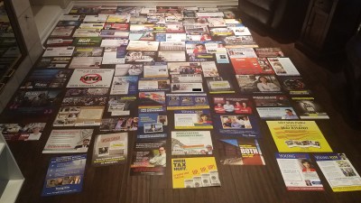![]() By contrast, here’s my paltry 6 pieces of mail from CD-45 laid out over the same section of my living room floor. I should note I did not include slates in either photo. |