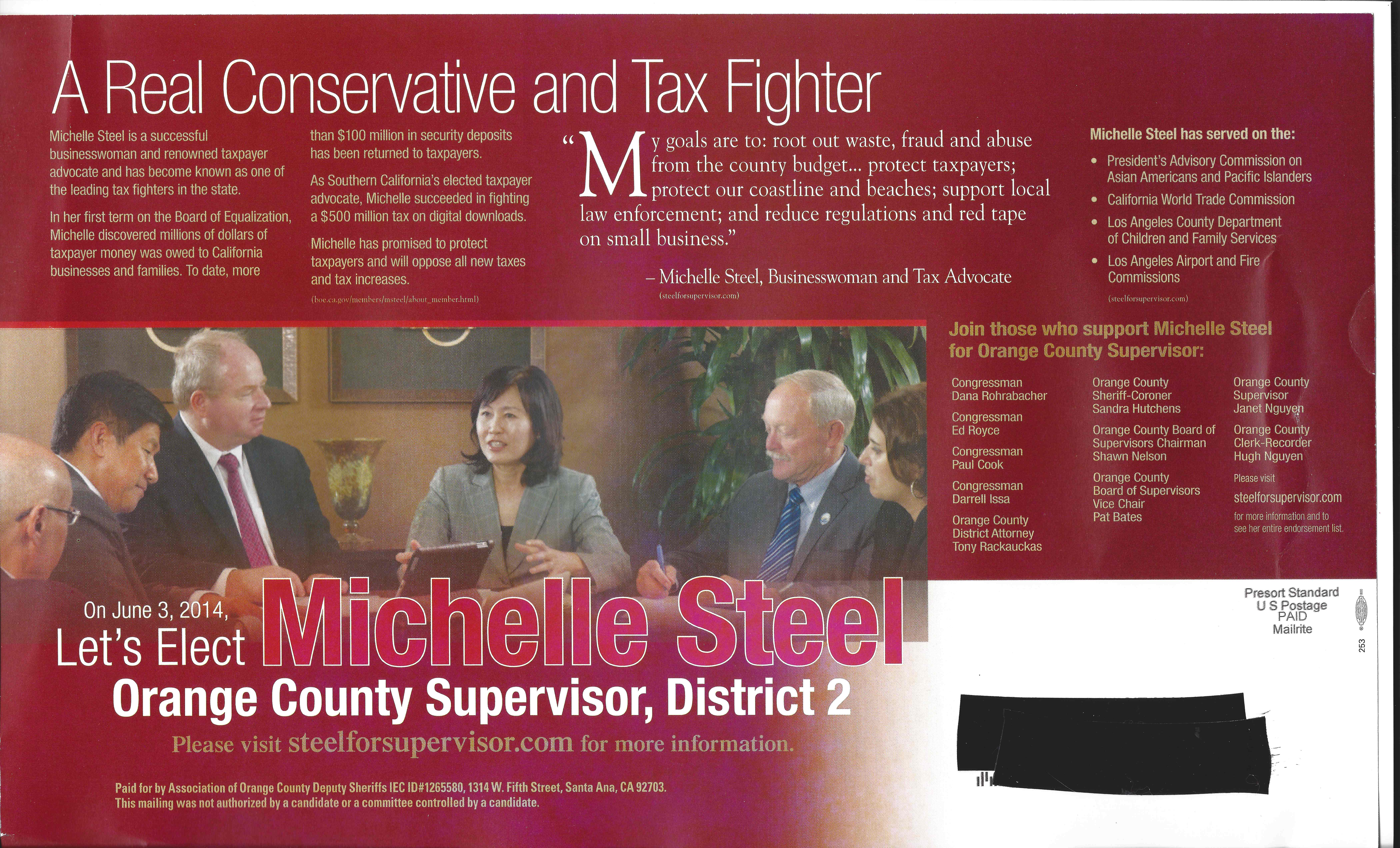 The first IE for the 2nd Supervisorial District has hit mailboxes today. The Association of Orange County Deputy Sheriffs has come out in support of Michelle Steel with this positive piece.