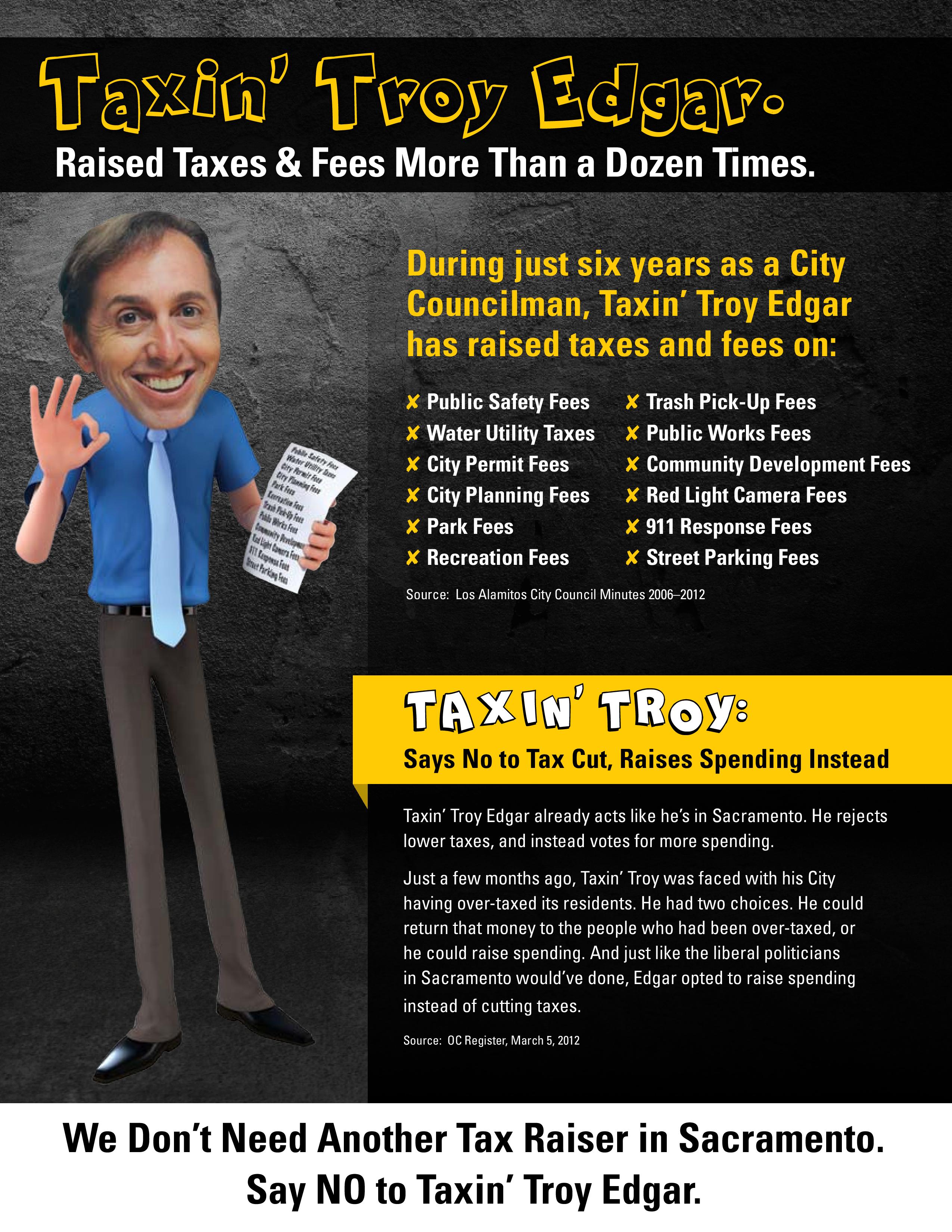 Again, Troy Edgar stands alone in supporting yet another massive tax expansion. With the Republicans’ Legislative Caucuses teetering on falling beneath the 2/3 threshold, sending Troy Edgar to Sacramento is a risk we just can’t afford. He’s just lived up to his name of “Taxin’ Troy” too many times.