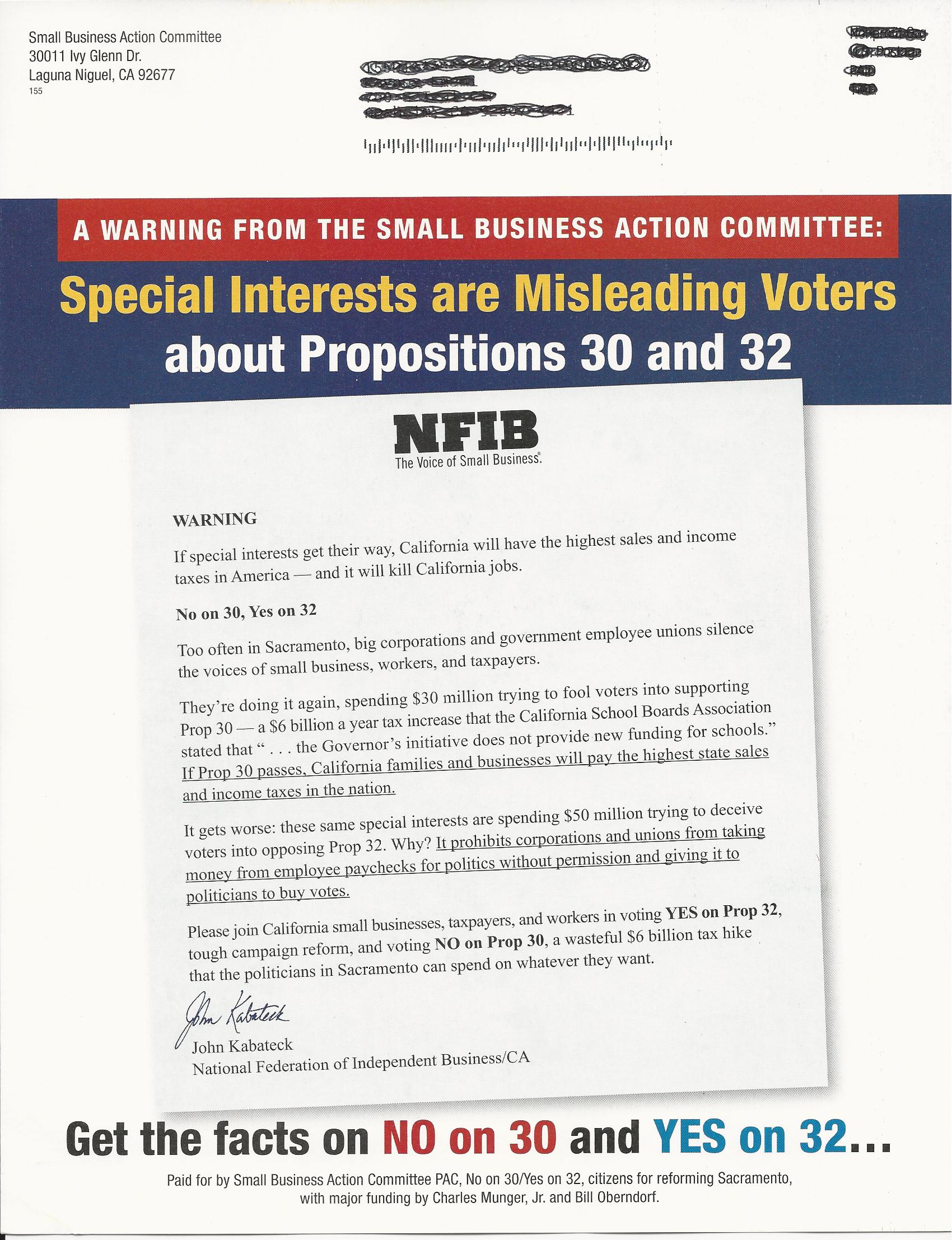 The mail has finally started to ramp up in my household. I received 2 pieces this weekend including this nifty 8.5 x 11 piece from the folks backing No on 30 and Yes on 32: